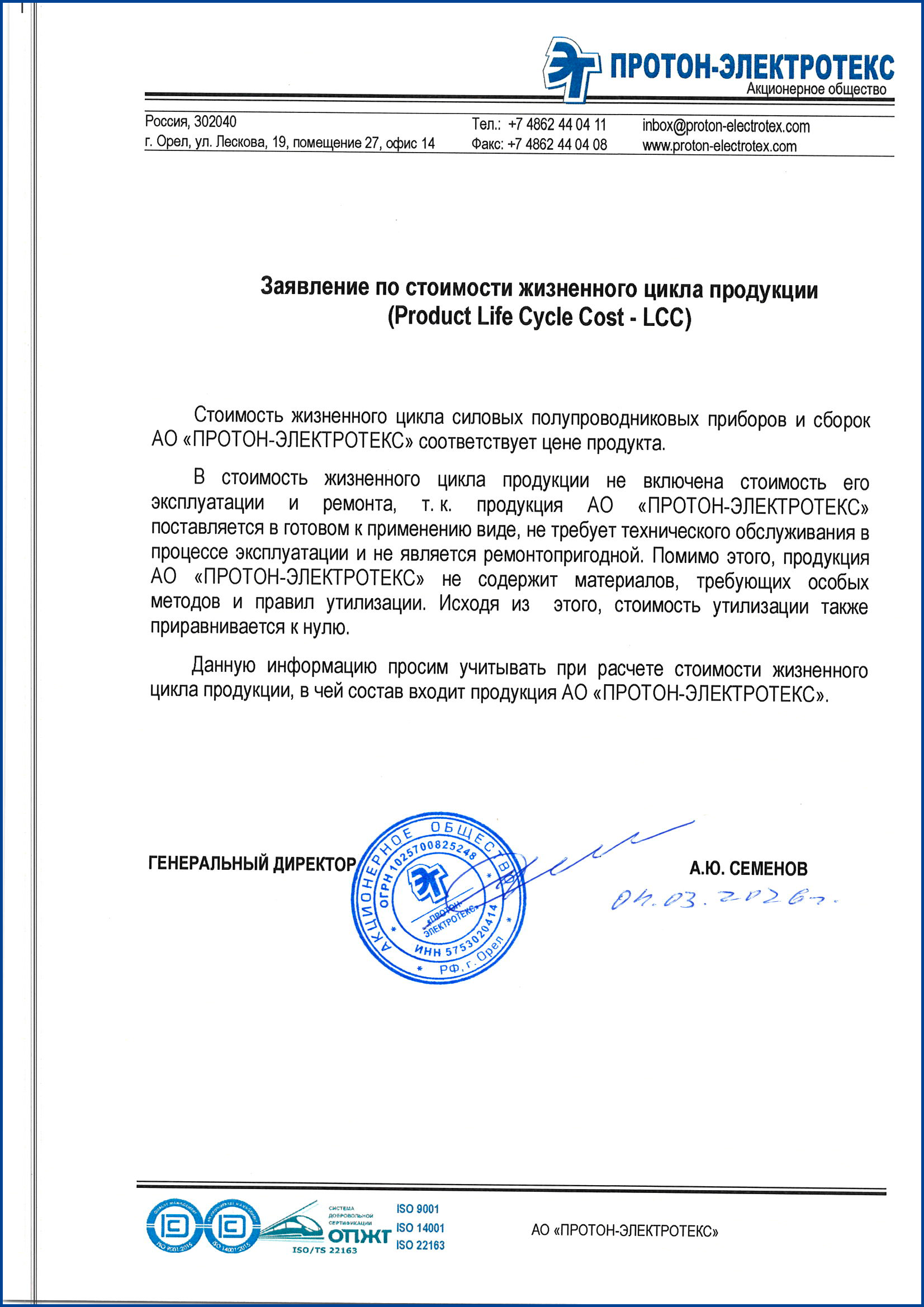 Заявление по стоимости жизненного цикла продукта