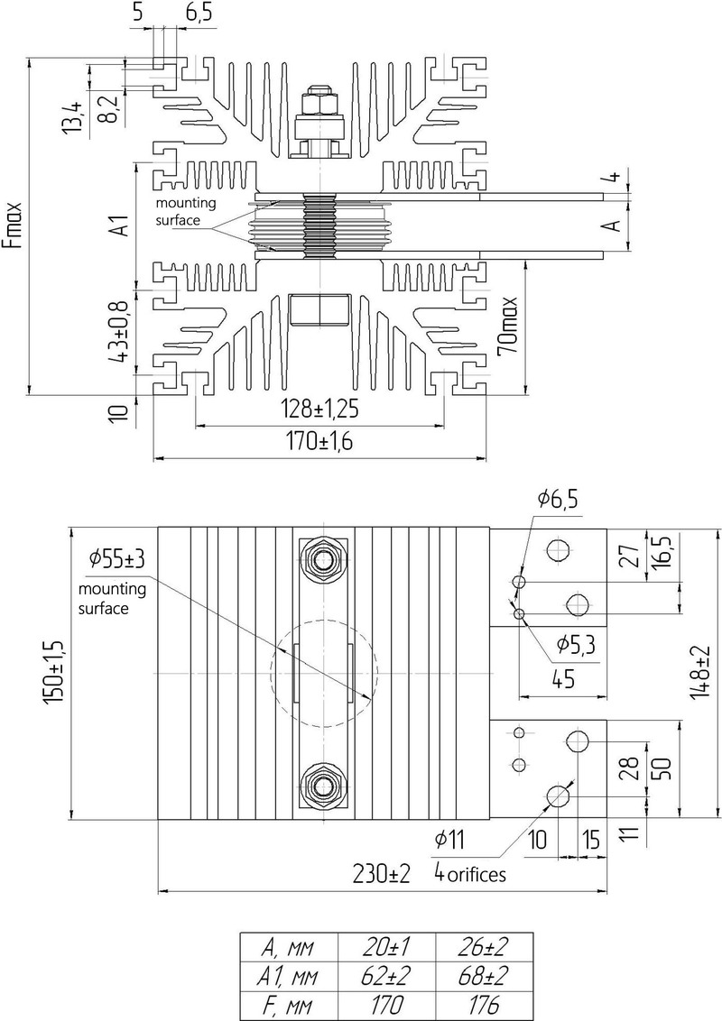 Монтаж осуществляется при помощи болтов, для чего в основании радиатора имеются резьбовые отверстия. Для обеспечения оптимальных параметров теплоотведения при монтаже силовых приборов обязательно следует обеспечить равномерность сжатия по всей поверхности охладителя и соблюсти заданное усилие сжатия.