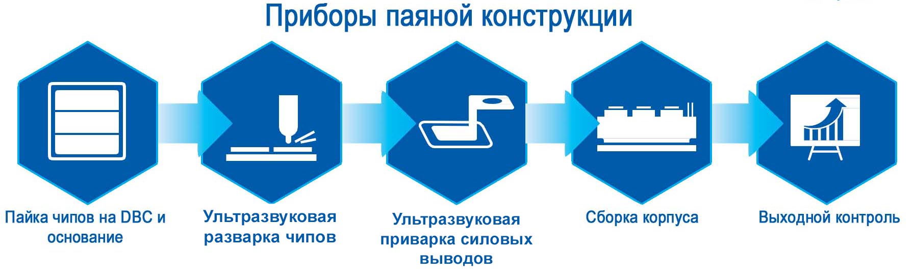 - сборка таблеточных, модульных и штыревых приборов, а также силовых сборок с охладителями на их основе, включающих в себя чистые операции сборки и герметизации полупроводниковых приборов и приемосдаточные испытания.